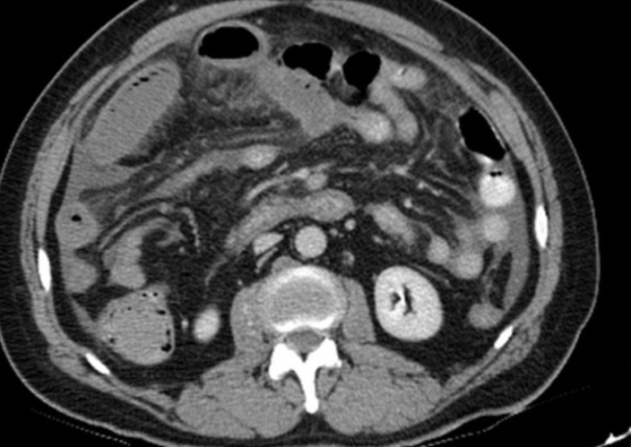 Perché la parete intestinale appare ipodensa nonostante sia presente enhancement mucoso?